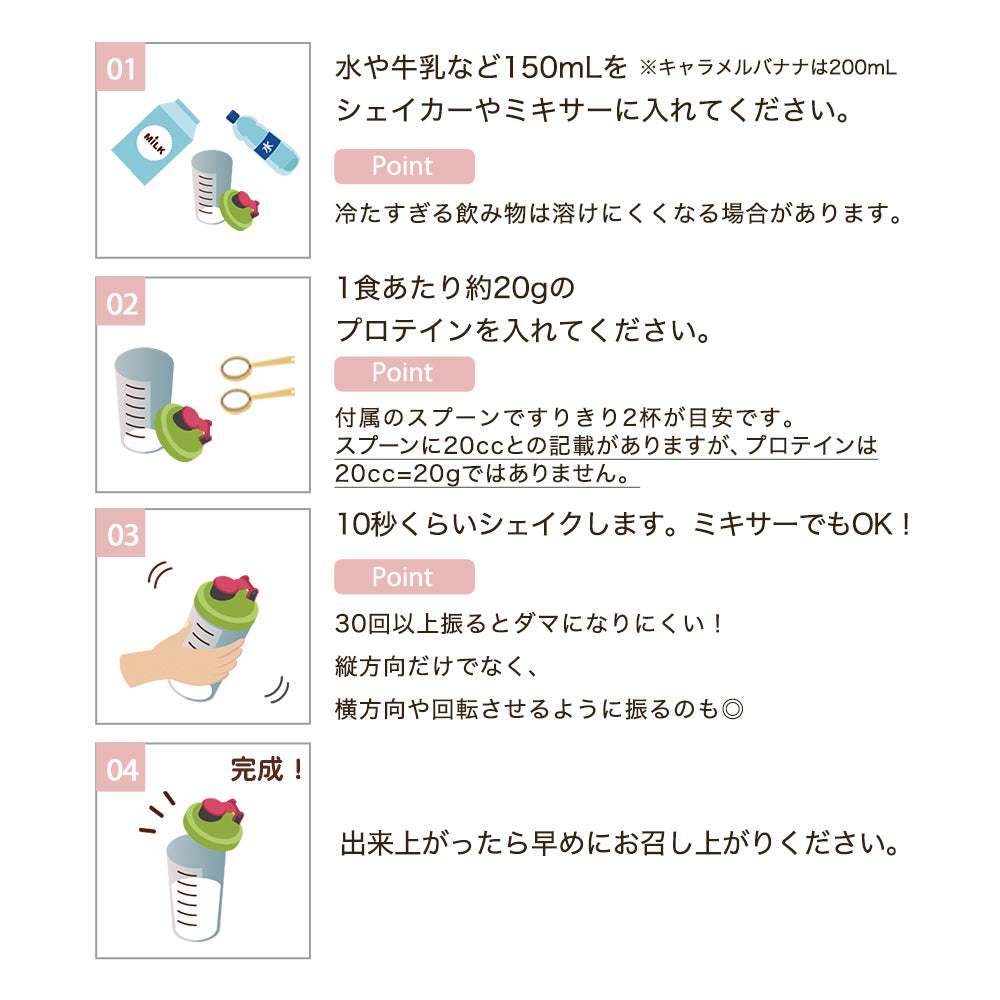 ※プロテインの摂取には個人差があります。スプーン2杯が多いと思われる方は量を減らしてください。