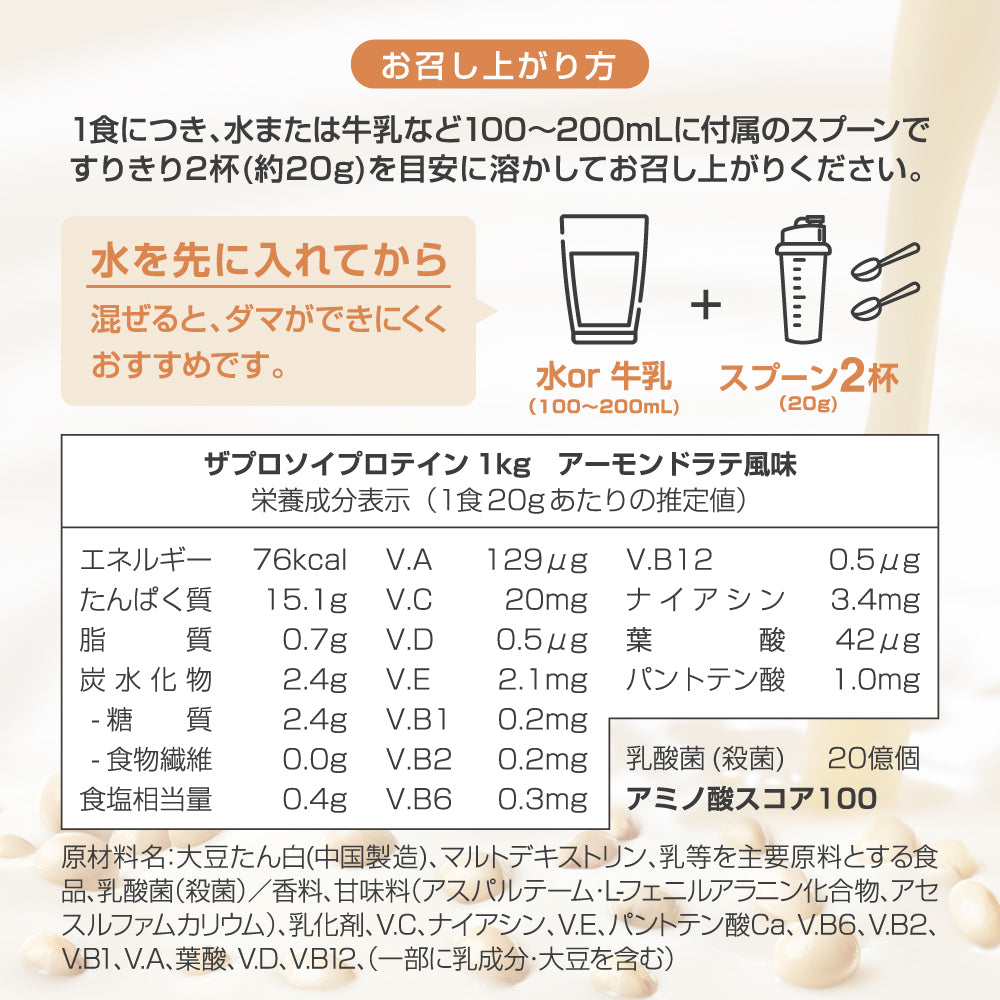 大豆たん白(中国製造)、マルトデキストリン、乳等を主要原料とする食品、乳酸菌(殺菌)/香料、甘味料(アスパルテーム・L-フェニルアラニン化合物、アセスルファムカリウム)、乳化剤 、V.C、ナイアシン、V.E、パントテン酸Ca、V.B6、V.B2、V.B1、V.A、葉酸、V.D、V.B12、(一部に乳成分・大豆を含む)
